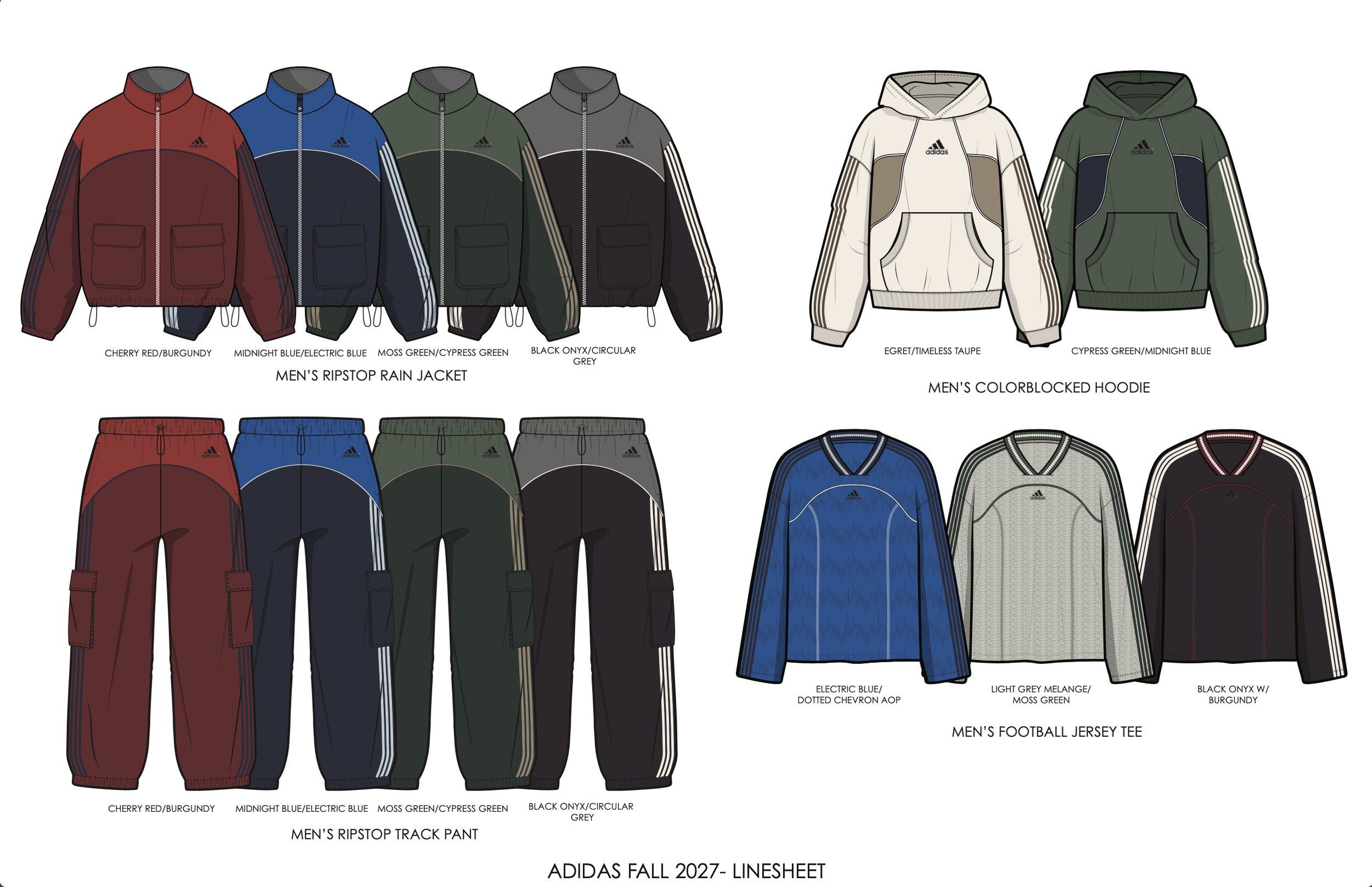 The collection functions as a modular system designed for maximum mix-and-match versatility. A ripstop tracksuit anchors the line with 'utility in motion' toggle cording and functional pockets. Color-blocked hoodies create head-to-toe coordination, while archival cotton jersey tops add textural variety. Every silhouette is engineered to pair with at least two bottoms, prioritizing personal styling and layering.