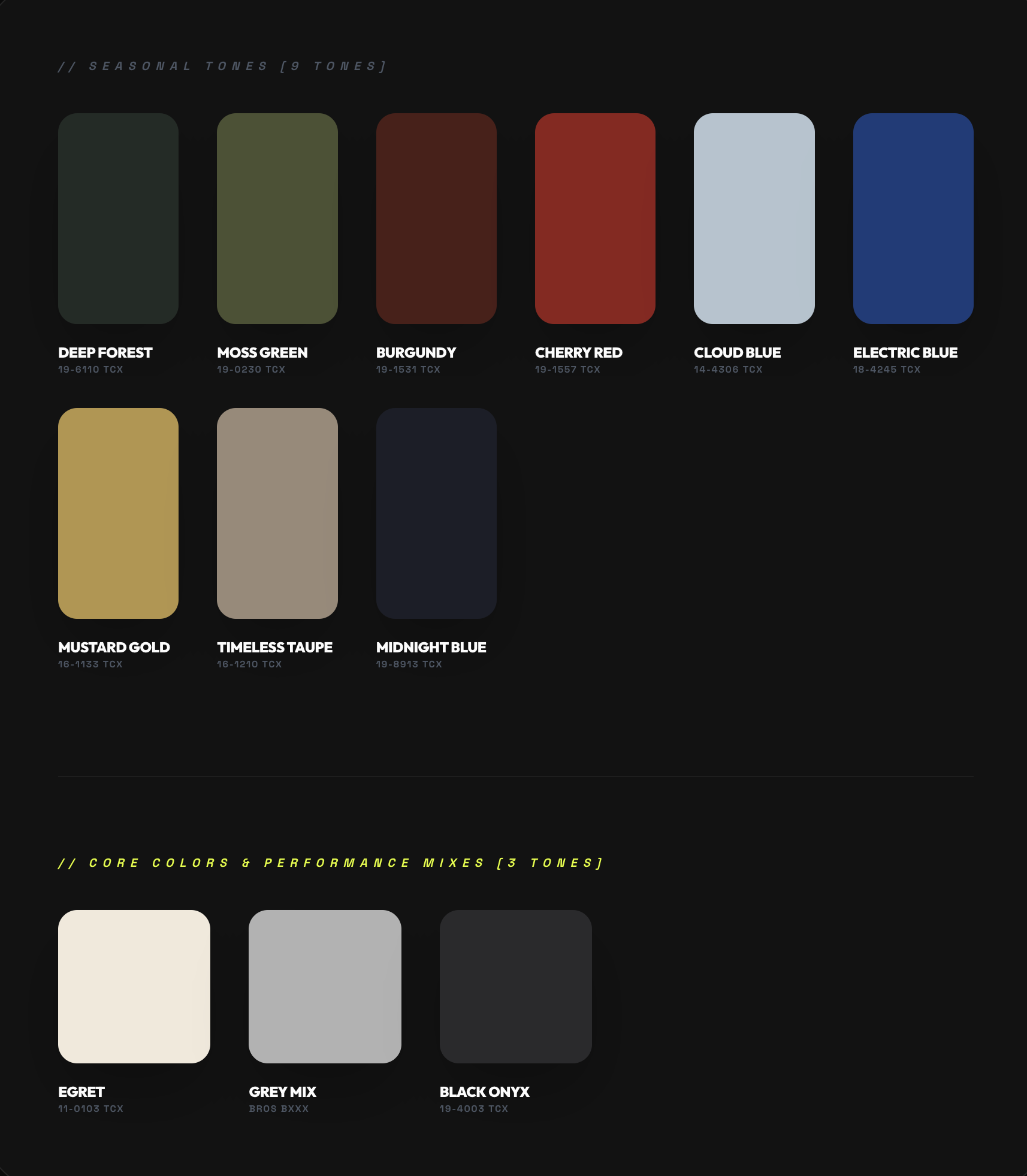 A sophisticated tension between high-vis sport pops like Electric Blue and archival anchors like Mustard Gold and Timeless Taupe.